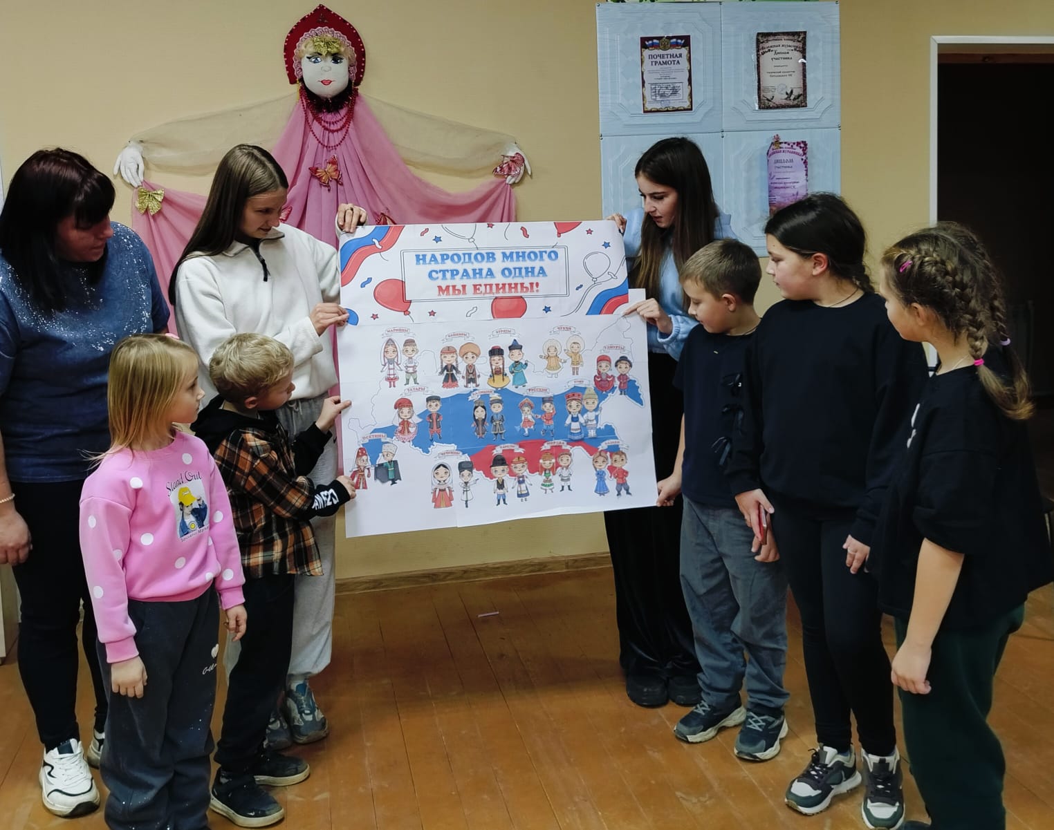 В Ситьковской сельской библиотеке прошел патриотический час, дети создавали плакат, посвященный Дню народного единства. Они клеили изображения представителей разных народов России. Дети, увлеченные общей идеей, выбирали, приклеивали, создавая яркую и красочную картину единства и дружбы. Это отличный способ познакомить детей с многообразием культур нашей страны и научить их ценить дружбу между народами.