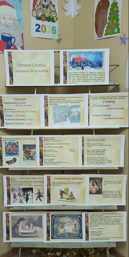 В Ситьковской сельской библиотеке оформлена информационная выставка "Ох уж эти святки, гадания, колядки".Которая представляет собой подробный и наглядный экскурс в историю и традиции Святок , гаданий и колядок, знакомя посетителей с богатым культурным наследием русского народа.