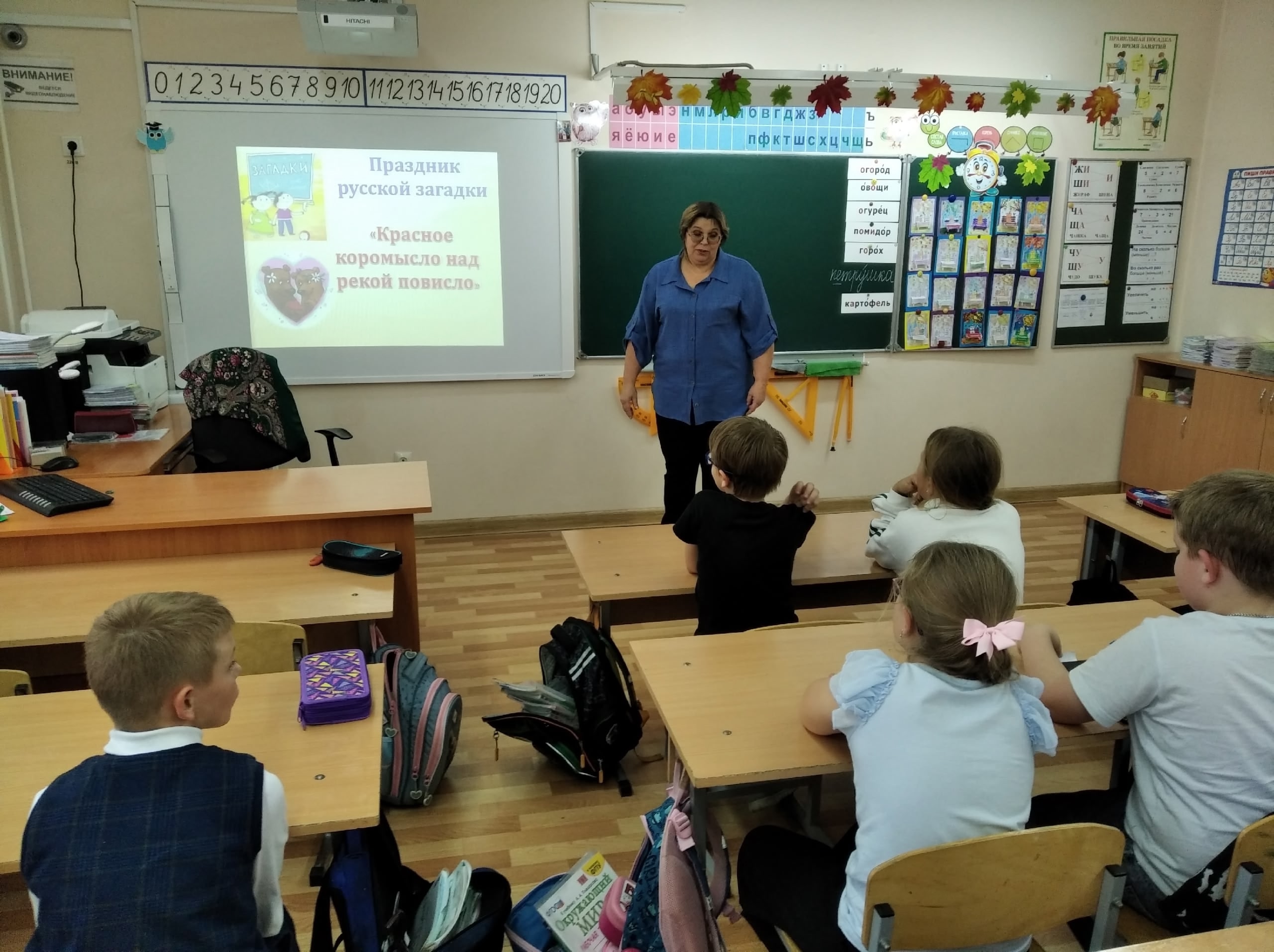 Сотрудник детской библиотеки подготовил и провёл для учащихся 3 «Б» класса МБОУ «Средняя школа №1» веселый и познавательный литературный час «Красное коромысло над рекой повисло», посвященное Дню загадок. В ходе мероприятия учащиеся узнали историю возникновения загадок и зачем они нужны. Далее ребята с удовольствием отгадывали загадки интерактивной викторины. Это были веселые загадки-обманки, загадки про зверей и птиц.