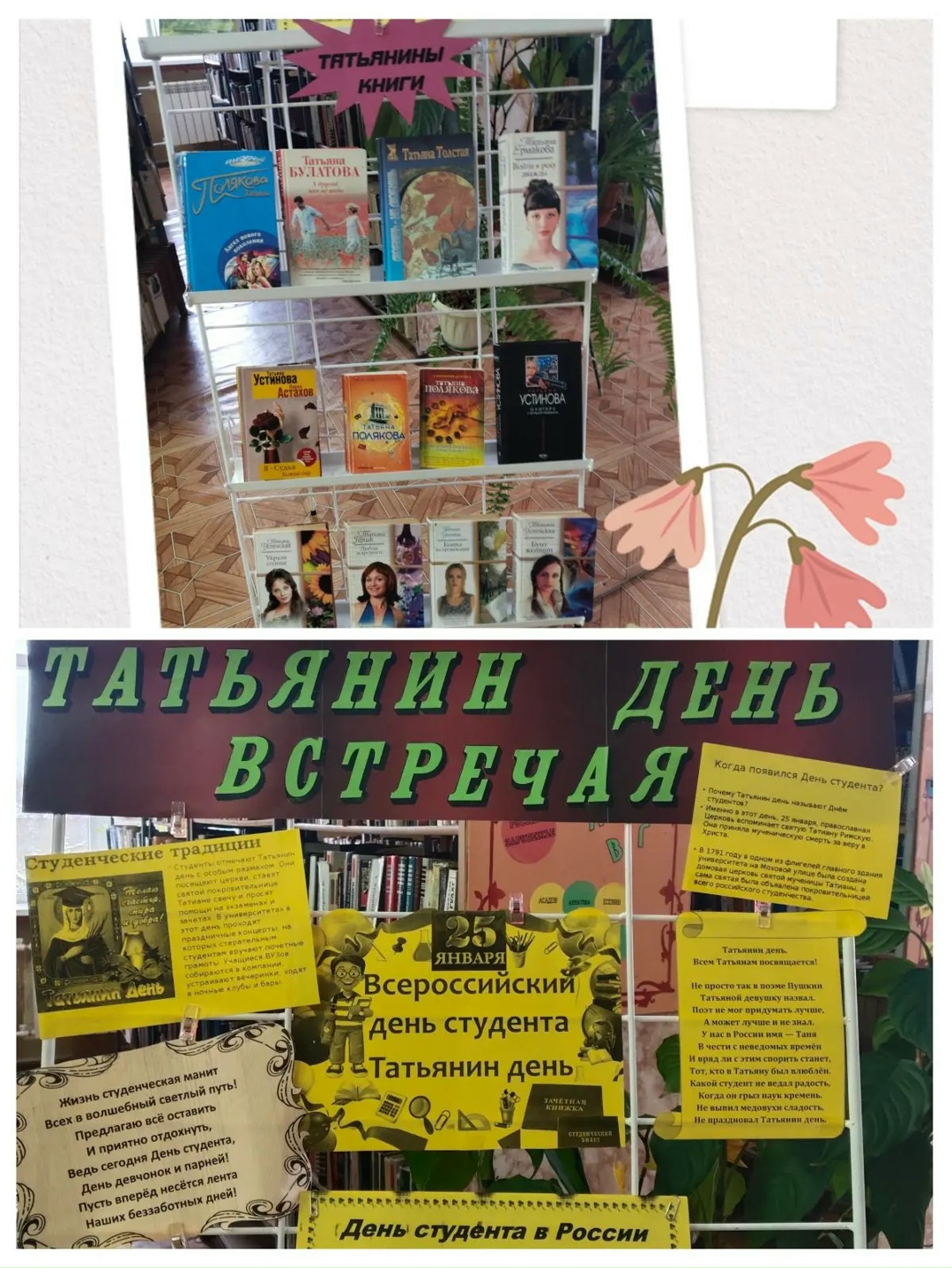 25 января отмечается День российского студенчества. Русская православная церковь 25 января вспоминает святую мученицу Татьяну, которая считается покровительницей студентов и педагогов. В этот день свои именины отмечают все женщины, носящие имя Татьяна. Абонемент районной библиотеки подготовил книжную выставку произведений, которые написаны Татьянами. Приглашаем читателей в увлекательное путешествие по страницам книг талантливых российских писательниц среди которых наши читатели могут найти для себя что-то новое и близкое.