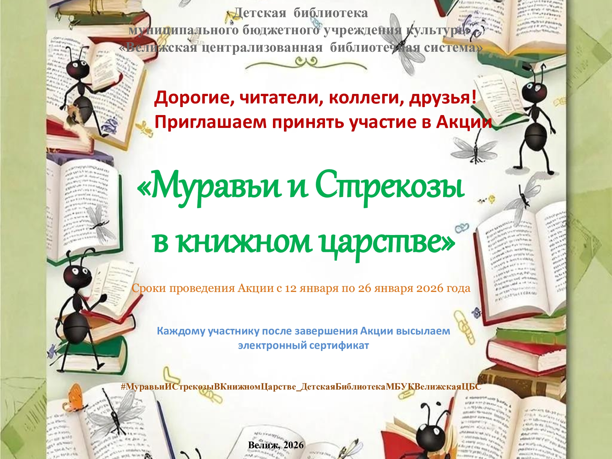 Детская библиотека Муниципального бюджетного учреждения культуры «Велижская централизованная библиотечная система» приглашает принять участие в сетевой Акции «Муравьи и Стрекозы в книжном царстве».