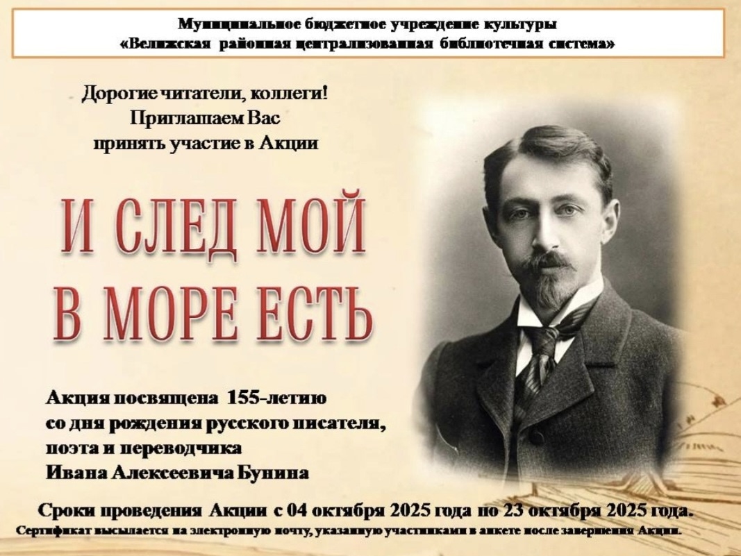Велижская районная библиотека приглашает принять участие в сетевой Акции «И след мой в море есть», посвящённой 155-летию со дня рождения русского писателя, поэта и переводчика И.А.Бунина.